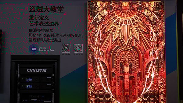 Cathedral of Thieves projection mapping display lit up in purple in the Christie booth at InfoComm China 2025