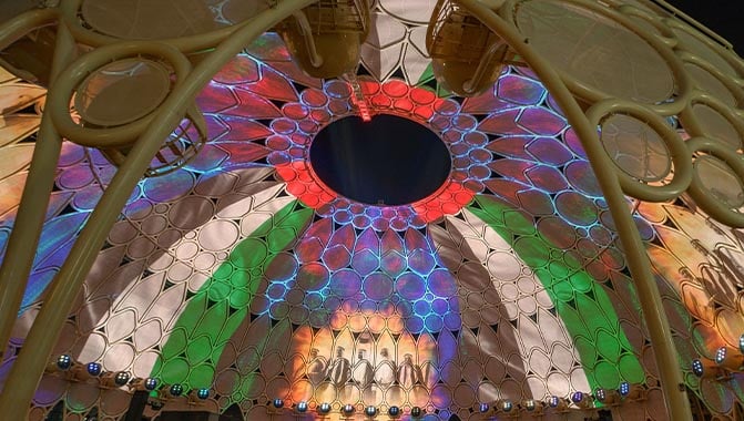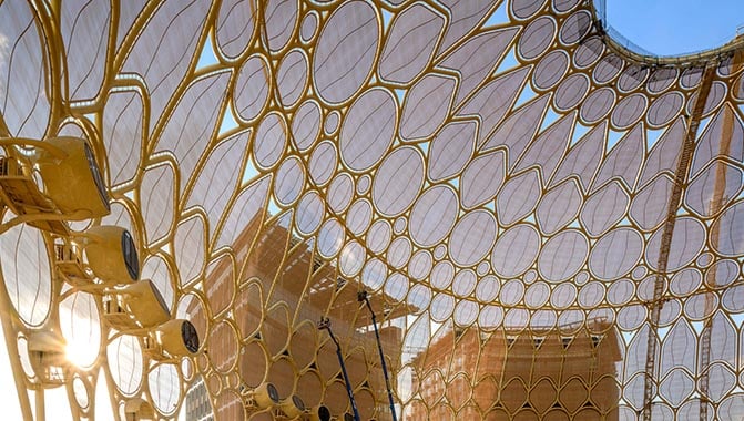 Standing at 67.5 meters tall and 130 meters in diameter, Al Wasl dome – a stunning feat of art and engineering that features a 550-tonne steel crown – sits atop Al Wasl Plaza, the beating heart of the Expo 2020 site in Dubai. The facility, which will be used for hosting a slate of immersive content and experiences across the event’s six-month run, features a grand trellis design that diffuses the sunlight during the day, while supporting a lush garden within the dome.