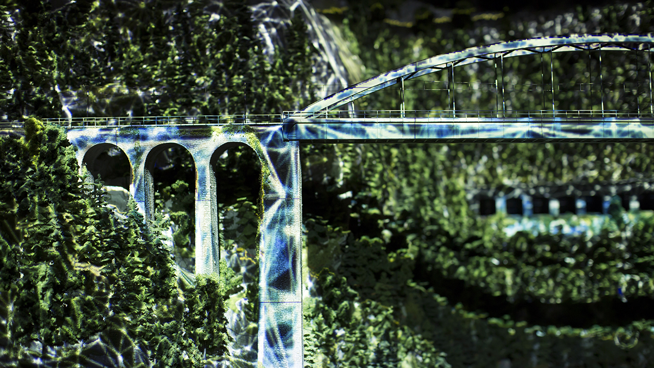 Quando è stata prodotta la mappatura, l'intero paesaggio di circa 550m² è stato sottoposto a scansione, ogni singolo edificio ed elemento del paesaggio, oltre alle pareti di sfondo. "Per fare questo, abbiamo utilizzato le immagini di prova prodotte con mappe UV e le abbiamo applicate agli oggetti 3D rilevanti, prima di adattarle alla reale geometria 3D", commenta Burmester.