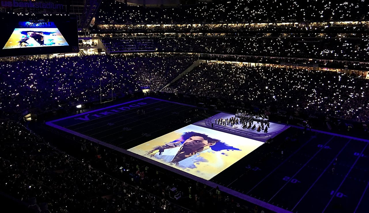 It’s a ground-breaking night: the Minnesota Vikings’ first home game of the 2016 NFL season at their newly constructed home field, the U.S. Bank Stadium in Minneapolis. As the half-time show begins, the stadium is bathed in purple light and the first strains of music begin. The Minnesota Orchestra, along with members of Prince’s New Power Generation and gospel group, The Steeles, perform late hometown popstar Prince’s iconic hit, “Purple Rain”.