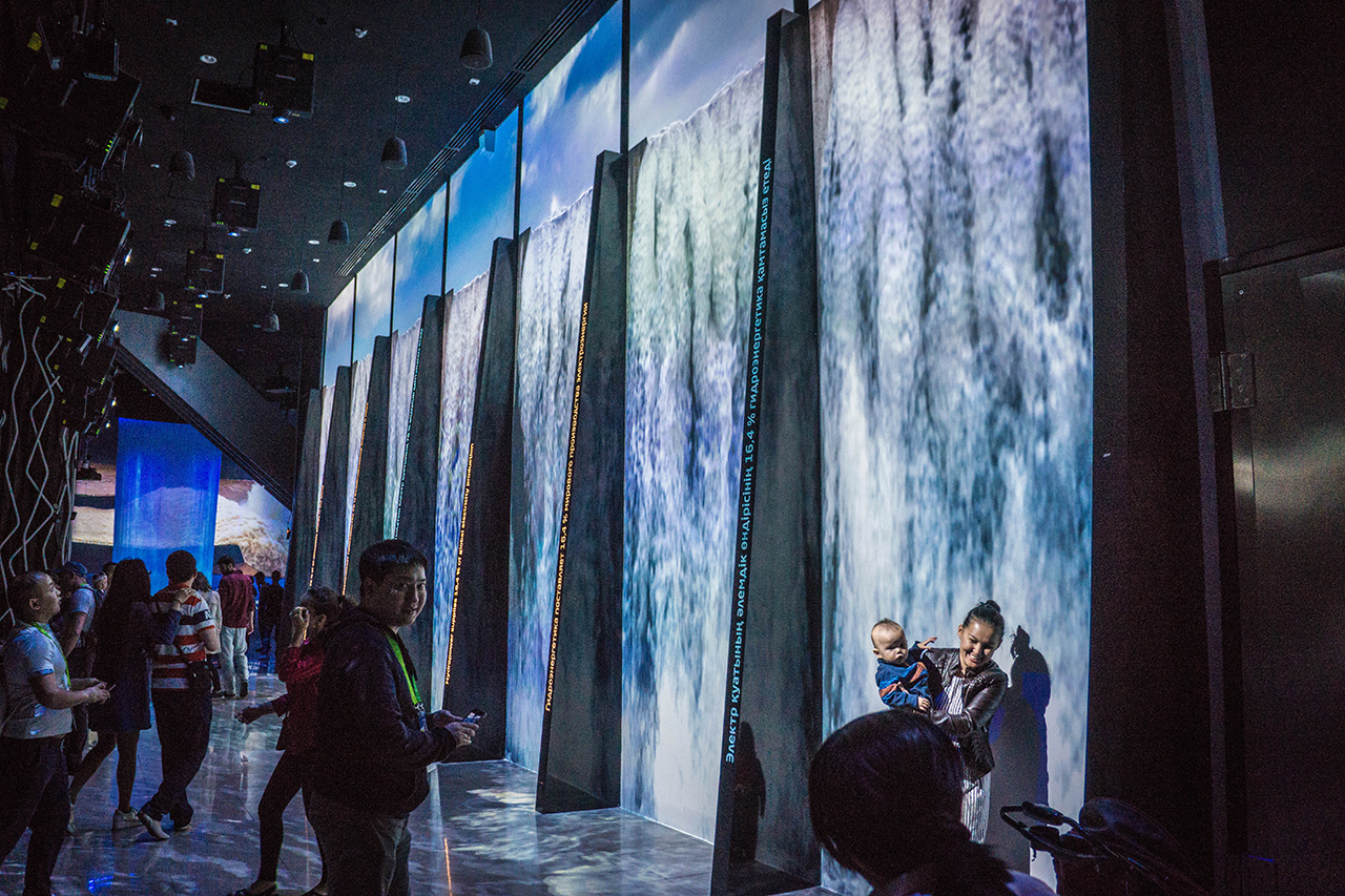 La société espagnole BGL s’est chargée de l’ingénierie audiovisuelle des deux premiers étages du bâtiment. Le premier étage était consacré au pays d’accueil, le Kazakhstan, et le deuxième étage à l’énergie hydraulique.