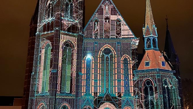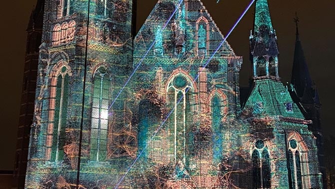 At the 19th century Augustijnenkerk (church), renowned international artist Yann Nguema and Arnaud Doucet created ‘Domas Luma’ combining projection mapping, light, laser and audio elements. The team was given the challenge of mapping onto the unique hand-built façade of the former church, comprising of 50,000 stones. Yann Nguema made use of his own custom software, and carefully mapped out each individual stone to allow the content to create a striking 3D effect.