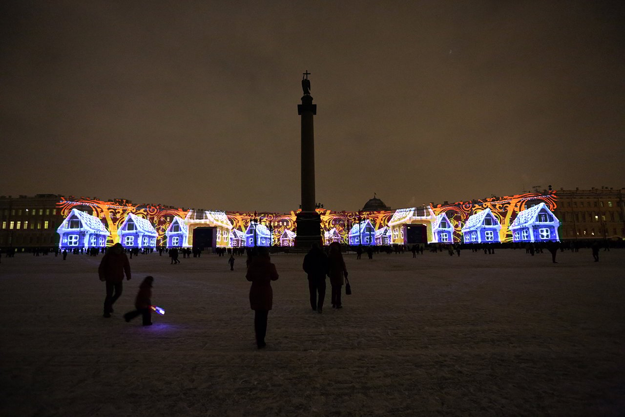 Зрители, пришедшие на Дворцовую площадь в эти зимние вечера, смогли виртуально, вместе с героями шоу, промчаться на санях Деда Мороза по разным уголкам планеты. Россия, Индия и Куба, Армения и Китай, Азербайджан и Вьетнам, Сербия, и снова Россия – красочные образы и символы разных стран сменяли друг друга как калейдоскоп. Контент для видеомэппинга был разработан известной российской командой Sila Sveta.