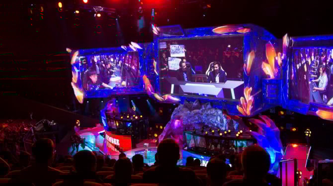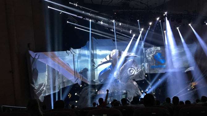 «На сцене были смонтированы кабинки для игроков, зрители в зале могли следить за ходом игры на центральном экране, на два боковых экрана транслировалось изображение с камер, которые снимали самих игроков, – делится подробностями Евгений Мариничев, технический директор BSS. – Проекторы Christie Boxer 4K30 мы установили на балконе, скомпоновав их в три группы по четыре устройства. На центр светили три проектора, и еще один – на фигуру одного из главных героев игры – Рошана, самого сильного нейтрального монстра в Dota 2.