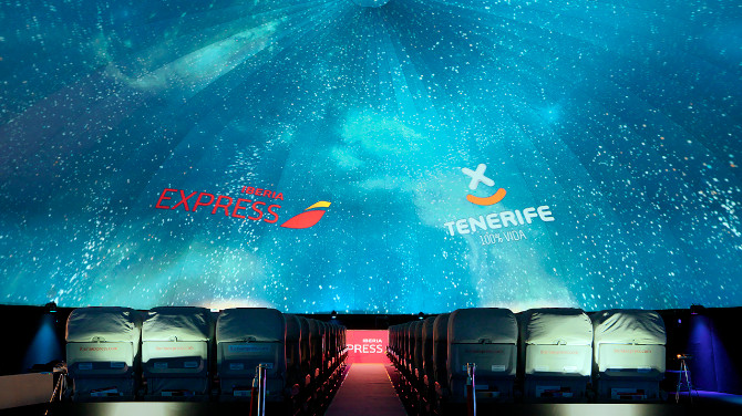 Mithilfe eines Vibrationssystems, das zeitgleich mit der 360°-Projektion reagierte, hatten die Besucher den Eindruck, dass das Flugzeug zur Startbahn rollte und schließlich abhob. Quasi "in der Luft" und nach der üblichen Begrüßung durch den Kapitän wurden Aufnahmen von Teneriffa eingeblendet, dem planmäßigen Flugziel, sowie eine audiovisuelle Produktion, die Geschichte und Erfolge von Iberia Express beschrieb. Mithilfe einer cleveren Mischung aus echten Bildern und Computeranimation fühlte das Publikum wie auf einem echten Flug.