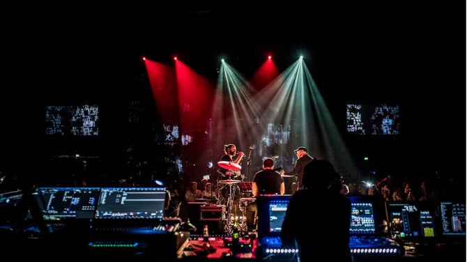 Der Christie Boxer4K30 wurde schwebend über dem Front of House (FoH), der Christie Crimson WU25 direkt über der Bühne installiert. Projiziert wurde unter anderem auf schwarze Bühnengaze, die in mehreren – insgesamt bis zu sieben – einzelnen Streifen gehängt wurde und das insgesamt sehr variantenreiche Setting unterstrich: Sie diente als Backdrop, gleichzeitig auch als Bühnenvorhang. Mit Gaze besetzte, beleuchtete Ringe konnten ebenfalls als Projektionsfläche dienen und die Musiker nach Bedarf in Szene setzen. Die vorderen Projektionsflächen waren dabei bis zu 16 m breit und in der Höhe variabel, die hinteren ca. 12 x 8 m groß.
