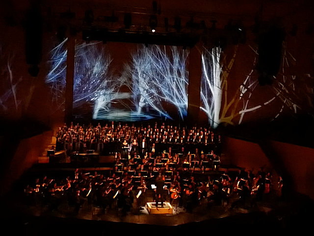 La proyección en blending abarcó toda la pared del fondo del auditorio (tras la orquesta y el coro) más parte de las paredes y palcos laterales, los cuales el equipo de Slidemedia tuvo que enmascarar para no deslumbrar a los espectadores. Entre laterales y frontal se cubrió una superficie de 70 por 12 metros aproximadamente.