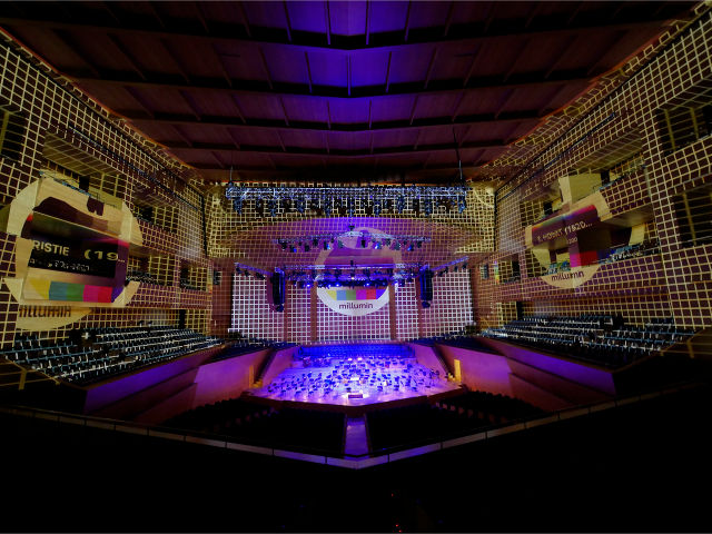 Uno de los principales desafíos para Slidemedia fueron las características arquitectónicas del espacio: "El Auditori tiene unas formas muy particulares, con planos en diferentes orientaciones, grandes estructuras que soportan luces y sistemas de audio", relata Fausto Morales. "Además, cuenta con un revestimiento en paredes de madera satinada. Tuvimos que hacer una serie de cálculos en ensayos para asegurarnos que la proyección iba a ser la correcta y contar con proyectores de suficiente potencia como los Christie para que se iluminase perfectamente."