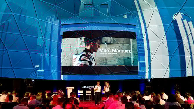 Площадь проекционной поверхности составила 300 квадратных метров при разрешении 2 800 х 2 800 пикселей. Короткий анимационный ролик, созданный новозеландской студией The Darkroom, был представлен в разрешении 3K, в полнокупольном формате, так что у присутствующих возникло ощущение, будто они мчатся на мотоцикле по разным дорогам. Далее последовал другой видеоролик, записанный специально для этого случая и адаптированный под вогнутую поверхность купола, но уже в формате 16:9 и Full HD: перед зрителями предстал Марк Маркес на Honda RC213V-S, который поделился с ними своими впечатлениями от нового мотоцикла.