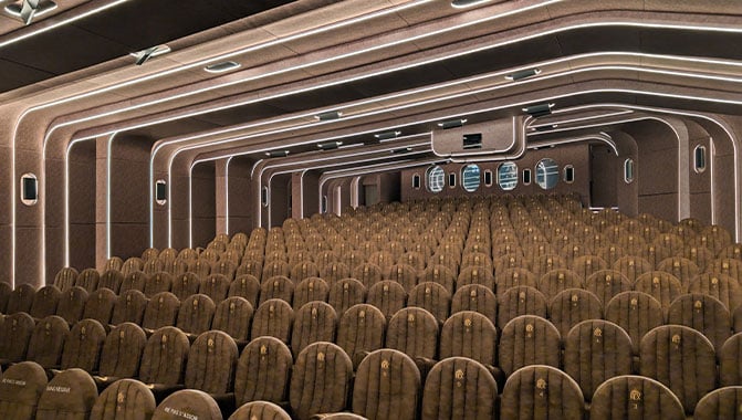 With the projector now housed in an enclosure in the ceiling, the former projection room at the back of the screen has been replaced by a stylish bar area, allowing guests to purchase refreshments without having to leave the new atmospheric space. ABP was the architect responsible for the redesign of the INFINITE room, which is located underneath Le Grand Rex’s ‘Le Grand Large’ auditorium. The customizable LED lighting system allows the cinema to color-match the film being screened. Brown was chosen as the colour for the seats and the walls to absorb optimum light and further enhance the lighting effect. Le Grand Rex now offers seven screens throughout its chic Art Deco building, which first opened its doors in 1932.