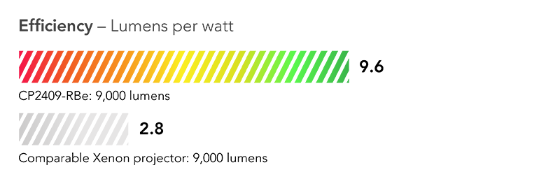 The CP2409-RBe is 236% more efficient than comparable Xenon models, producing 9.4 lumens per watt. Lower energy costs reduce the total cost of ownership by 70%.