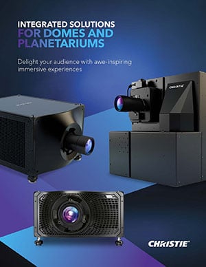 Capture your audience’s imaginationExplore outer space, dive under the ocean, soar with eagles or enter fantastical worlds only seen in the movies. These experiences draw audiences of all ages to planetariums, giant screens and attractions where dome theaters show larger-than-life visuals. Christie’s dome solutions can help you delight both first-time guests and repeat visitors with awe-inspiring immersive experiences on opening day and throughout decades of year-round operation. Lifelike experience. Day-one quality, every day.From high frame rates and high-contrast images to lifelike colors and almost limitless resolution, Christie’s dome solutions provide spectacular, smooth, vibrant 2D or 3D visuals to capture your guests’ imaginations. Our multi-projector systems provide the highest brightness, image uniformity and best possible dome coverage, whether you’re looking for partial dome coverage or an 8K or higher fulldome experience. Christie® Mystique® automated camera-based alignment solutions keep multi-projector blended arrays looking perfect show after show and Christie Pandoras Box® Server provides powerful show control functionality. Want to entertain your guests with Hollywood movies? It’s easy to incorporate a Christie DCI-compliant cinema projector in an insert window. |