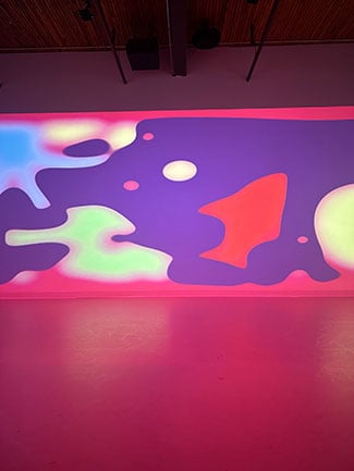 An abstract image in shades of red, purple, and blue is projected onto a wall.