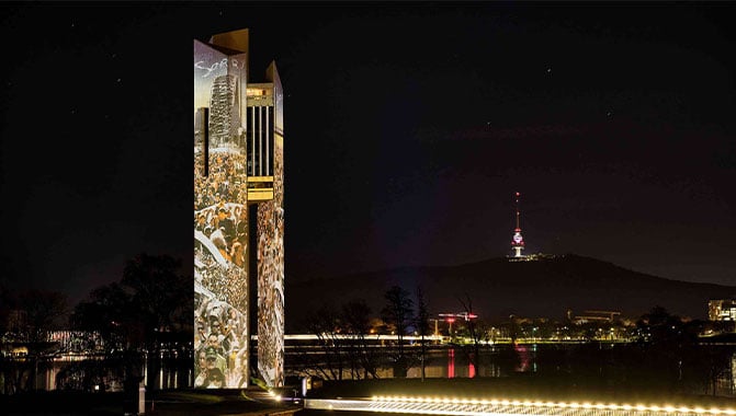Fitted with 57 bronze bells, the National Carillon is played on a regular basis during the year by both local and visiting carillonists. It is often used to celebrate national days and performances are staged in conjunction with other events such as Australia Day. The iconic landmark’s unique tower-like structure makes it an ideal venue for outdoor projections at night. It was for this reason that Christie’s valued Australian partner, The Electric Canvas (TEC) – well known for its experience and expertise in large scale events – was approached by the National Capital Authority (NCA) to develop architectural projections on the Carillon’s façade in support of National Reconciliation Week 2020.