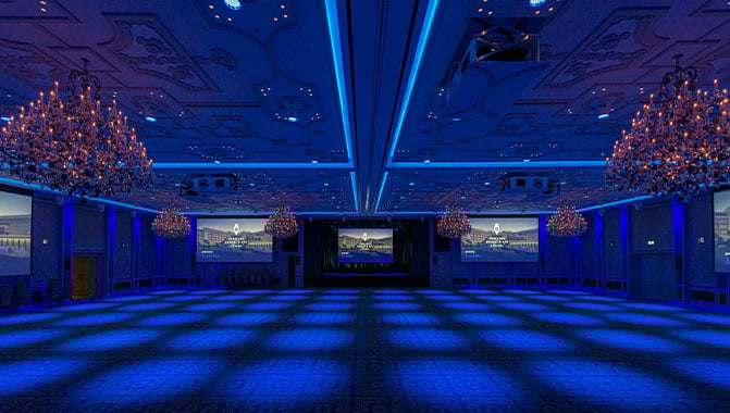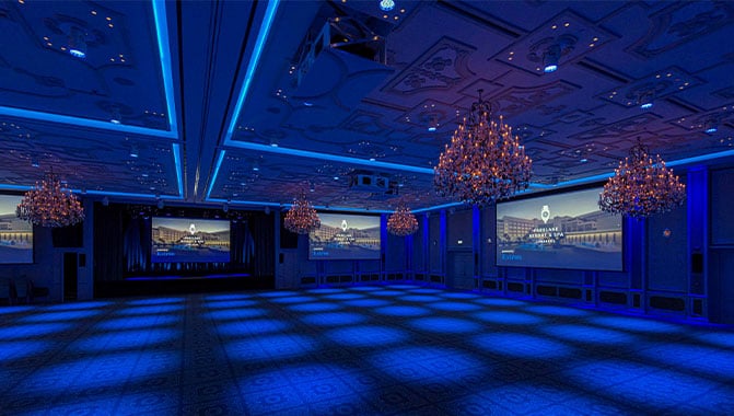 An onsite AV team inside the hotel operates the technology on a day to day basis, with ALA’s teams available for any specialist requirements. “There’s a lot of support involved for this caliber of installation, and there is always someone on call.” The versatile room – suitable for social and business events – can also be divided into two sections, and cater for up to 600 persons for dinner on round tables, with space for a dance area.