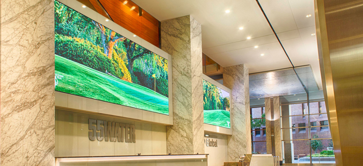 New York’s iconic 55 Water Street was looking for a visual display that would transform the lobby without overwhelming the space. The new Christie LED video wall transforms the lobby into a functional yet beautiful space, as innovative high-tech successfully merges with the lobby’s original classic décor.