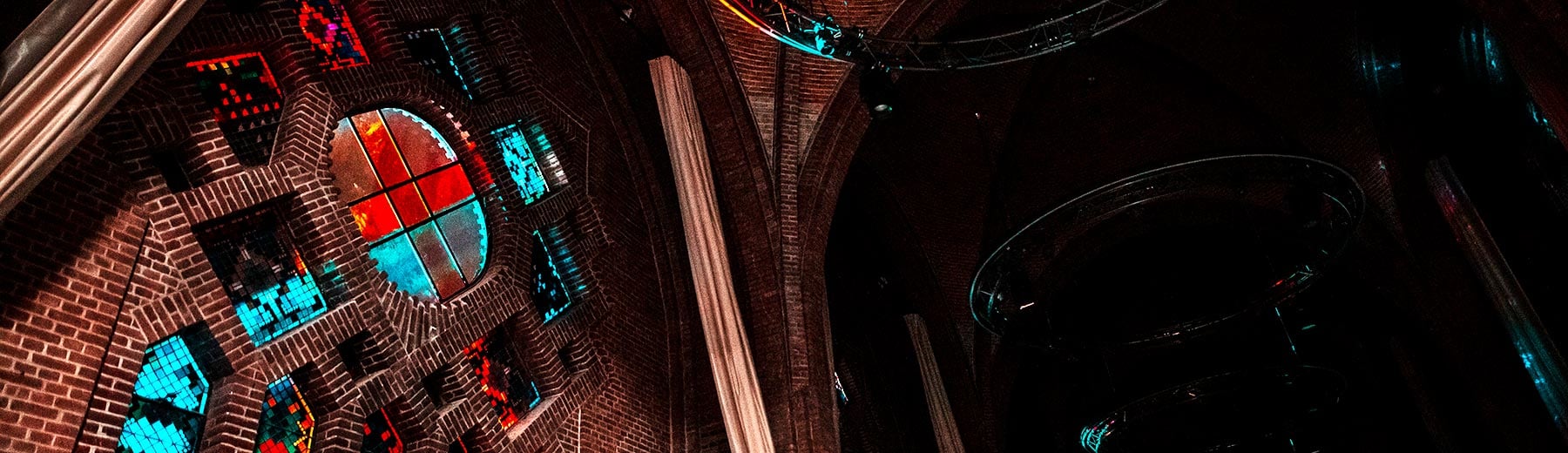 At the rear of Augustijnenkerk, the medium of light is expressed using four 20,000 lumens Christie HS Series projectors with the mapping focused on the three sets of iconic stained glass that form the façade of the building, providing a unique effect. The striking architecture – combined with the vibrant mapping performance – depicted humanity’s inner faith. “New to this project was the combination of light coming from inside to out (of the buildings), and a projection on the outside,” says Ronald Romakers, director of GLOW. “In the early days it was impossible to do that, but with these powerful Christie projectors, it works.”