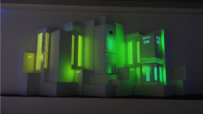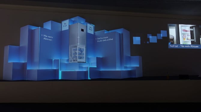 The Liebherr project involved "the presentation of a product portfolio of the latest generation of energy-efficient refrigerators. By means of six Christie Boxer 4K30s, we created brilliant and visually demanding 3D mapping for Liebherr-Hausgeräte GmbH - an independent company with a real sense of tradition."