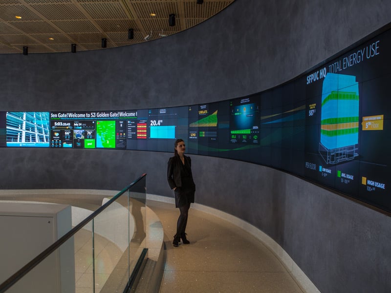 Comprising a total of 160 Christie MicroTiles, the curved wall sits atop a superstructure pedestal custom fabricated by rp Visual Solutions and stretches 58’ long. Officially named the Digital Arts Panorama, the video wall is controlled by a custom content management program developed by the Obscura Digital team which allows the SFPUC communications department to upload and manage information on the wall effectively and efficiently.