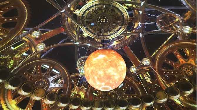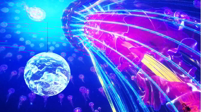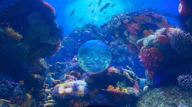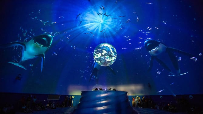 The full effect of this unique twin-dome theater has been brought to the fore through a rousing marine-themed show titled “Ocean & Universe”, which showcases the evolution of the universe and how numerous species of marine life have thrived throughout that history. Visitors are able to experience highly-realistic imagery such as enormous blue whales swimming overhead, vibrant corals teeming with bioluminescent fish, and vast blooms of jellyfish decorating the surface of the ocean with a myriad of color.