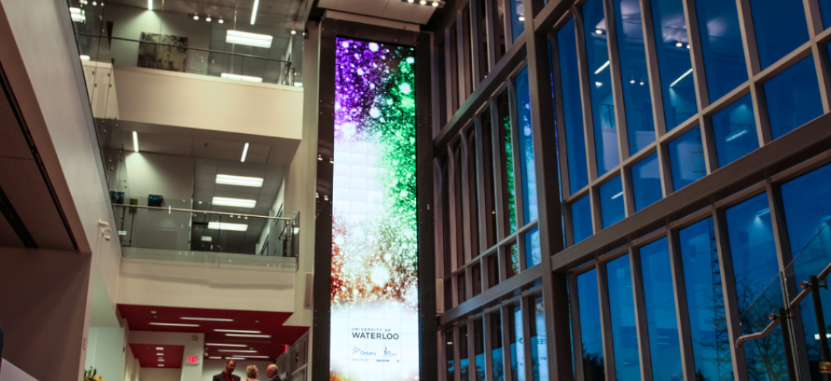 When the University of Waterloo broke ground on their brand new Stratford Campus, they knew they wanted the finished product to make a bold statement. That’s where Christie® MicroTiles® came in — 150 of them to be exact — forming the stunning centerpiece of the Stratford Campus’ atrium in a three-story-high digital video wall. This high-resolution Christie MicroTiles lobby display wall serves as a showcase for student content, highlighting creative accomplishments and providing a unique canvas for digital media research.