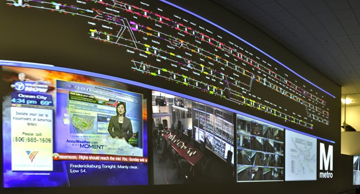 With 86 stations, 106 miles of track and 1,116 rail cars, the Washington, DC Metro is the second largest rail transit system in the United States. To help synchronize the entire system, the Metro selected 12 Christie HD10K-M 3-chip DLP® projectors and four Christie Vista Spyders for its Command Center and Rail Operations Center (ROC). With the Christie technology in place, Metro staff can now react immediately to any emergency or slowdown.