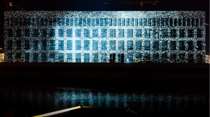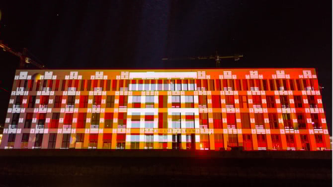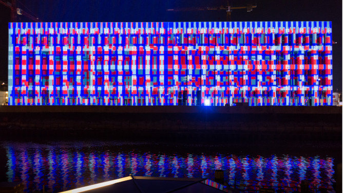 Deux serveurs Pandoras Box Quad ont été utilisés pour reproduire le contenu complexe : un flux continu de symboles se déplaçant verticalement, horizontalement et en cercles sur la largeur de 120 m de la façade pour créer un écran de 3 000 m² de points et de lignes, de grilles et de filets, de nuages et d'essaims.