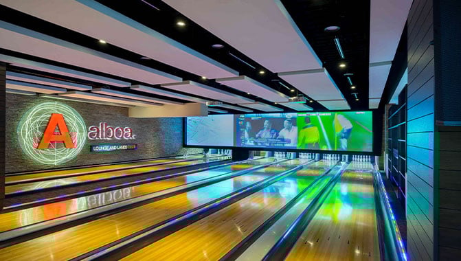 On average, every Alboa center uses five projectors to screen sports, music and entertainment as well as in the bowling area, projecting onto a single screen with a gain of 1.8.