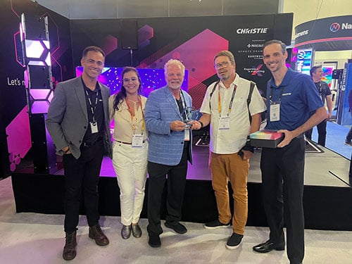 The awards were presented at InfoComm 2024 by Clayton Brito, sales director Latin America, Enterprise, Christie; Felipe Aguiar, sales manager Brazil, Enterprise, Christie; and Bryan Boehme, vice president of Global Sales, Enterprise, Christie.