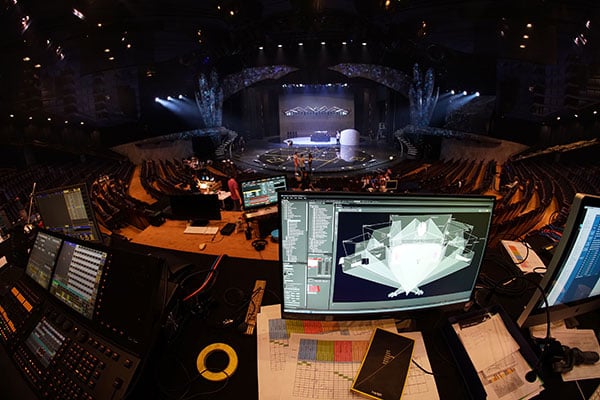 The technology rooms, including the lighting control and, next to it, the projection room with the servers, are located above the spectator seating, and Christopher "Fletch" Flügel, responsible for the project at loop light, said, "We trained colleagues on-site and helped them to set up the system." They also created the high-resolution 3D mapping onto the various structures of the stage and outside areas, which is projected by 24 projectors.”