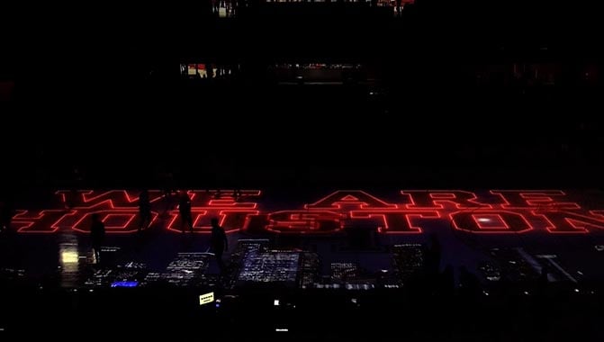 HOUSTON, Texas – The University of Houston recently updated the projection mapping content for its basketball team, the Houston Cougars, creating a dramatic, on-court pre-game show at the Fertitta Center. The bright, 3D graphics were created by Quince Imaging, and enabled by a range of Christie® solutions installed by Quince, including 3DLP® projectors, Mystique™, a Pandoras Box® Server, and Terra®, an AV-over-IP system.