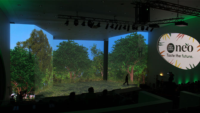 Lisboa (Portugal) - La reciente presentación oficial en Portugal de la nueva cafetera Nescafé Dolce Gusto NEO tuvo como protagonista una espectacular proyección envolvente de 182.000 lúmenes realizada por ADLC Audiovisuais con nueve proyectores Christie® que inundaron de luz y color el auditorio de la Fundação Champalimaud en Lisboa.