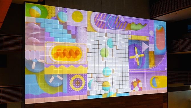 Jointly delivered and installed in Shinjuku Atrium by Ushio Lighting Inc. and CIMA Co., Ltd., with planning and direction accomplished by P.I.C.S. Co., Ltd., the Christie D4K40-RGB delivers big, bright and bold images on the mapping area that includes a “kinetic wall” measuring 16 meters in width and 8.5 meters in height. This “kinetic wall” features 180 modular cubes, each measuring 40 cm, that can be programmed to move back and forth individually. Creative expressions ranging from a highly dynamic wall surface, large-scale and 3D projection mapping, as well as data visualization can be achieved using a combination of video, audio and lighting effects.