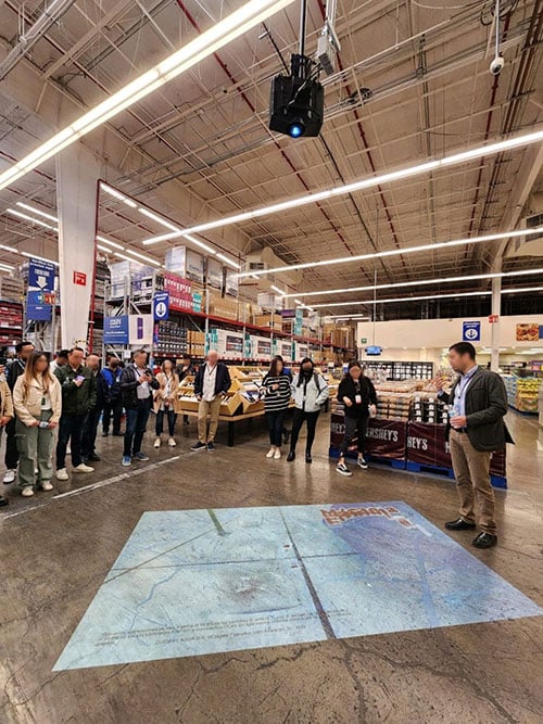 A group gathers around a projected image on the floor of a store.