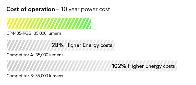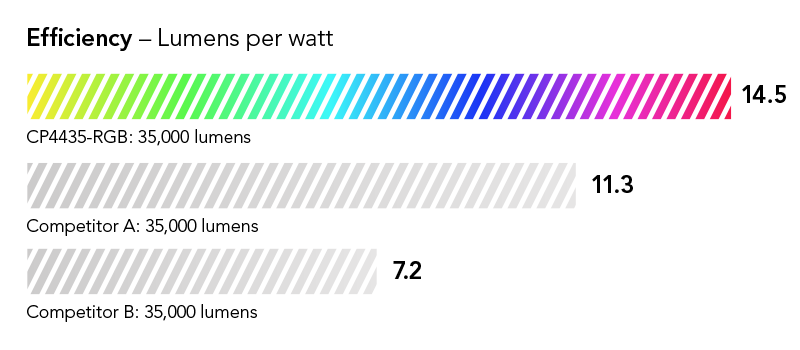 The CP4435-RGB is 22% more efficient than its competitors, producing 14.5 lumens per watt. Lower energy costs reduce the total cost of ownership by 28%.
