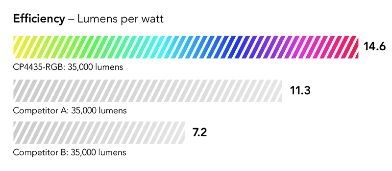 The CP4435-RGB is 22% more efficient than its competitors, producing 14.5 lumens per watt. Lower energy costs reduce the total cost of ownership by 28%.