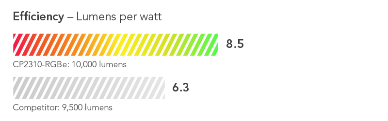 The CP2310-RGBe is 26% more efficient than comparable Xenon models, producing 8.5 lumens per watt. Lower energy costs reduce the total cost of ownership by 27%.