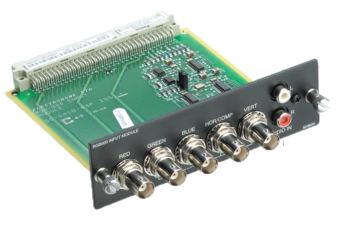 This module receives analog RGB input signals from computers or other RGB source devices. It accepts 3, 4, or 5 wire RGB video (sync-on-green, composite sync, or separate horizontal and vertical sync), up to 500 MHz bandwidth and BNC connectors for RGB signal inputs.
