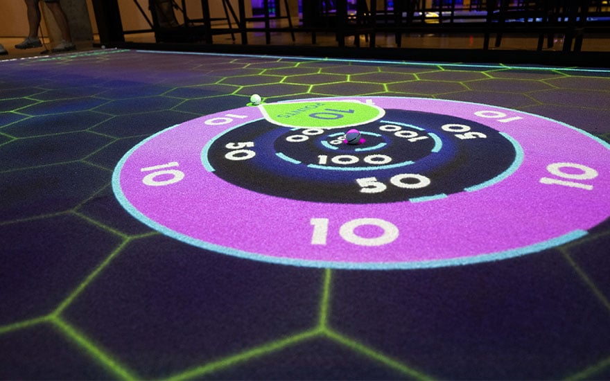 In addition to designing the virtual putting areas, Beaudry Interactive also created the content, developing an initial offering of three games for guests of all levels to play. Guests compete against each other to hit their ball to stop on virtual targets to score points. This concept is easy to explain, but execute? That’s a whole different ball game.