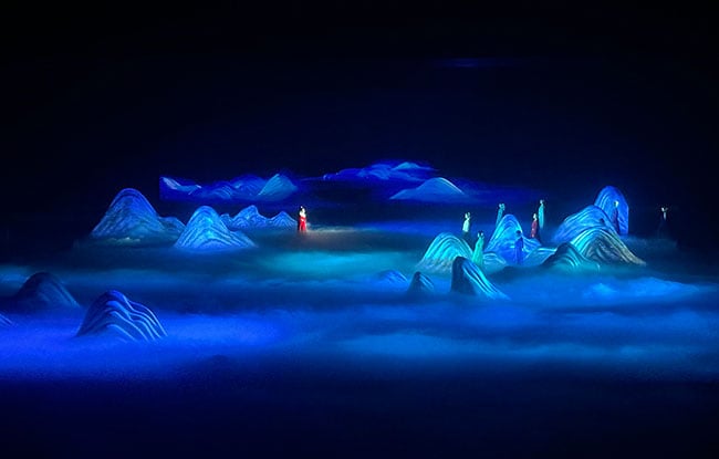At one point, fog effects create the illusion of a scene that takes place over a mountainous area shrouded by clouds — an effect that elicites gasps from the audience due to its incredible beauty. It’s no wonder that this captivating performance at the “Real-Unreal Theatre” stands out as the main highlight of Unique Dream of Red Mansions; its operator shared that it’s the most watched and celebrated show within the entire complex.