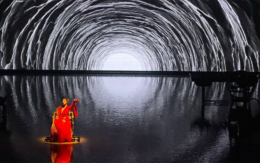Among these performances, the live, hour-long show in the “Real-Unreal Theatre” was the most impressive. A talented cast and stunning set design transport the audience into various scenes from the novel. Thirty-six intricately carved doors reveal beautifully lit set pieces with water effects on the floor that cast fascinating reflections. Vivid projections, created by 15 Christie DWU1082-GS projectors, added another layer of depth to the spectacle, making it an unforgettable experience for all.